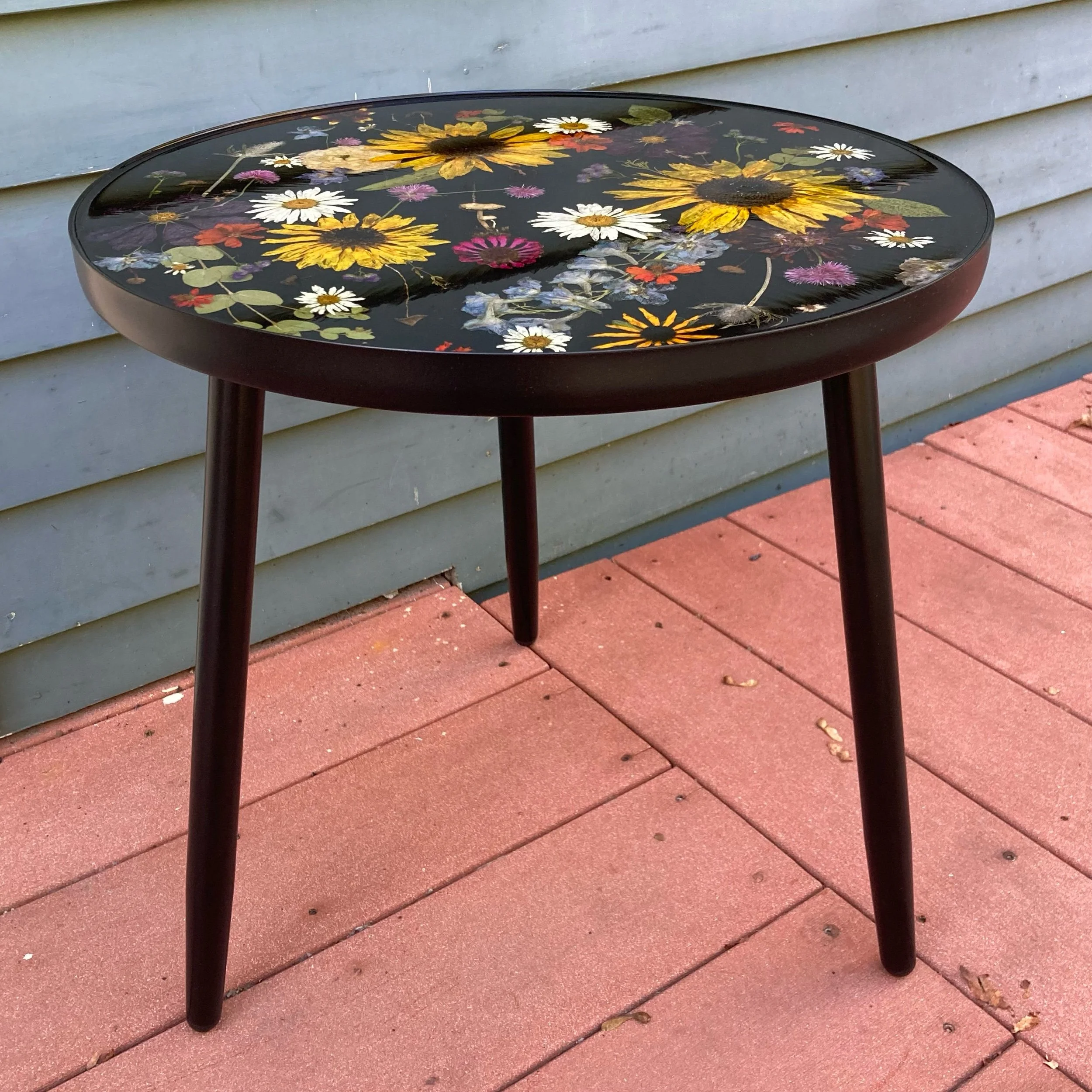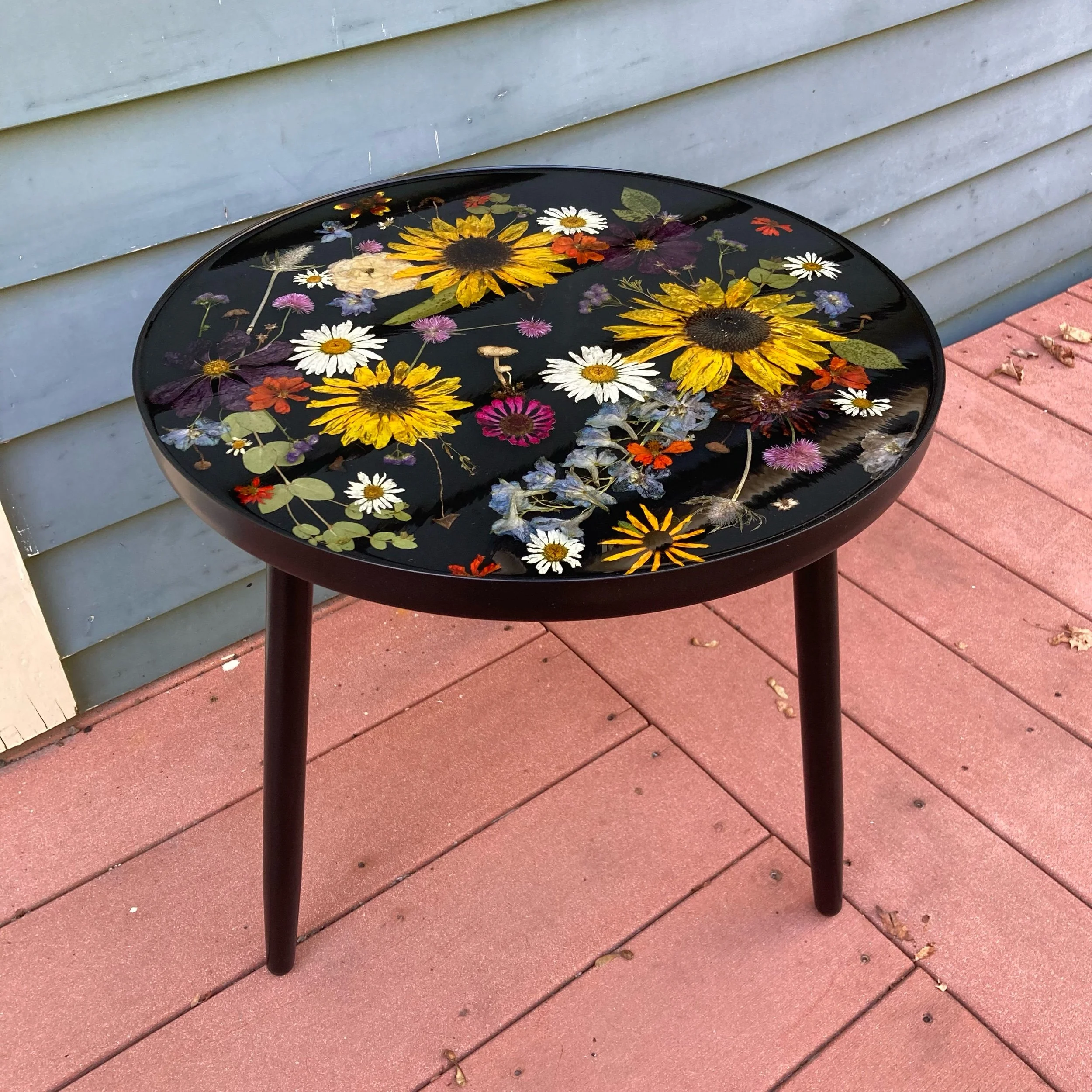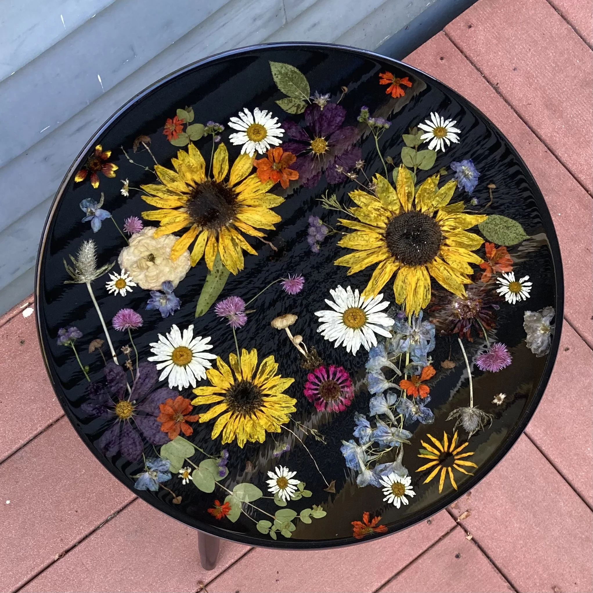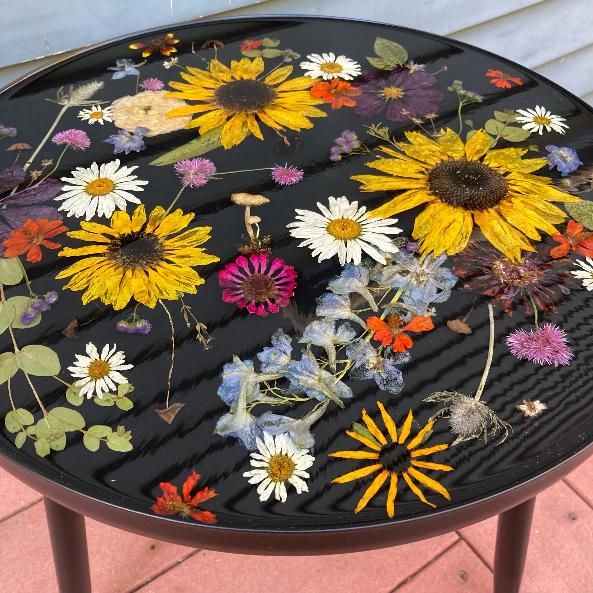 This playful statement table features silica dried flowers (including sunflowers) and mushrooms. This is a one-of-a-kind table; get it while you can!