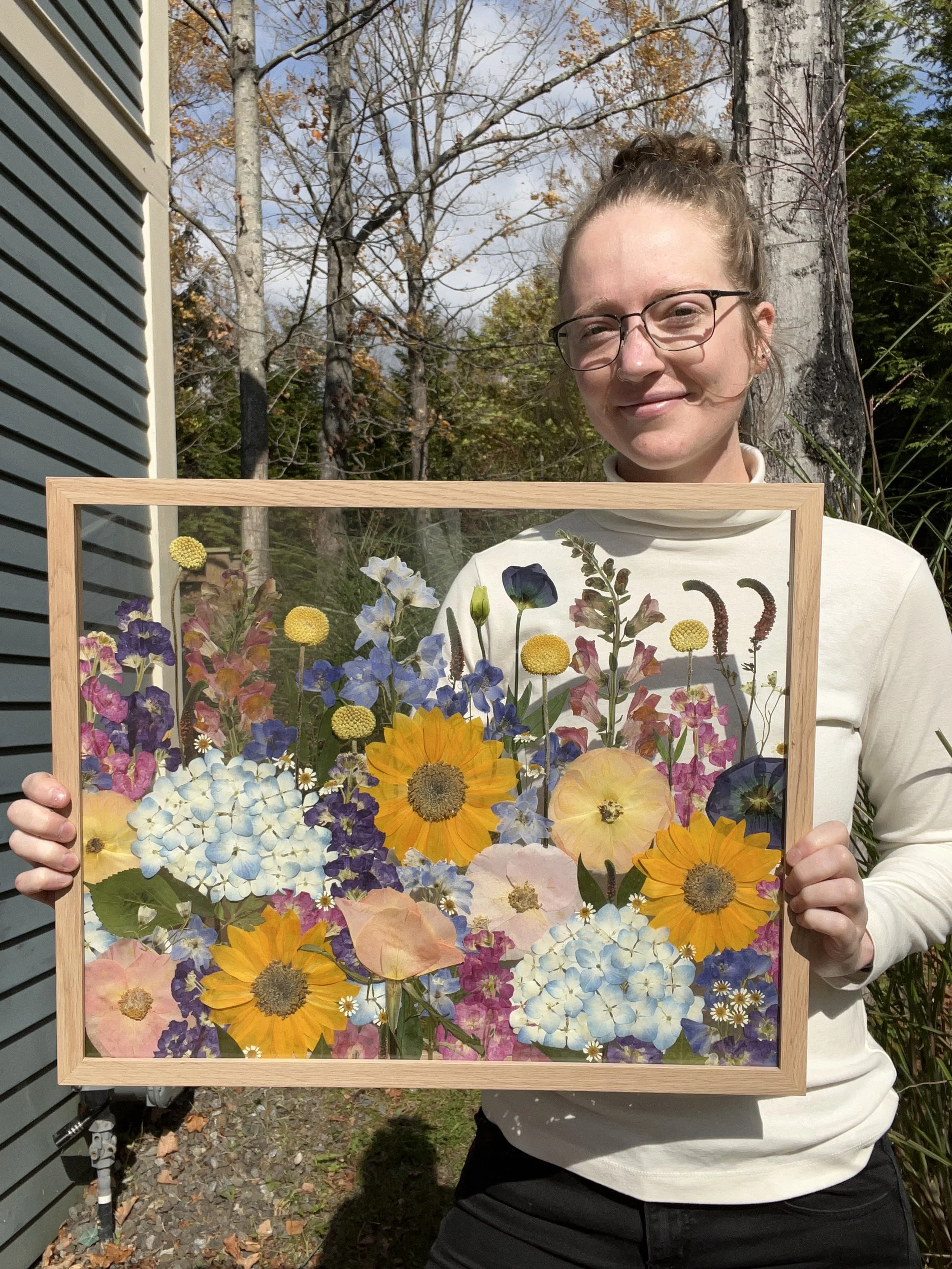 Please note that flowers can change during the drying process (red roses turn to a dark magenta and white dahlias turn to a yellowish-white, for example), so don’t be surprised if your pressed bouquet artworks don’t match the color of your fresh bouquet flowers exactly. Depending on the flower, white blooms can turn to an off-white with yellowish hues and some develop light brown hues.